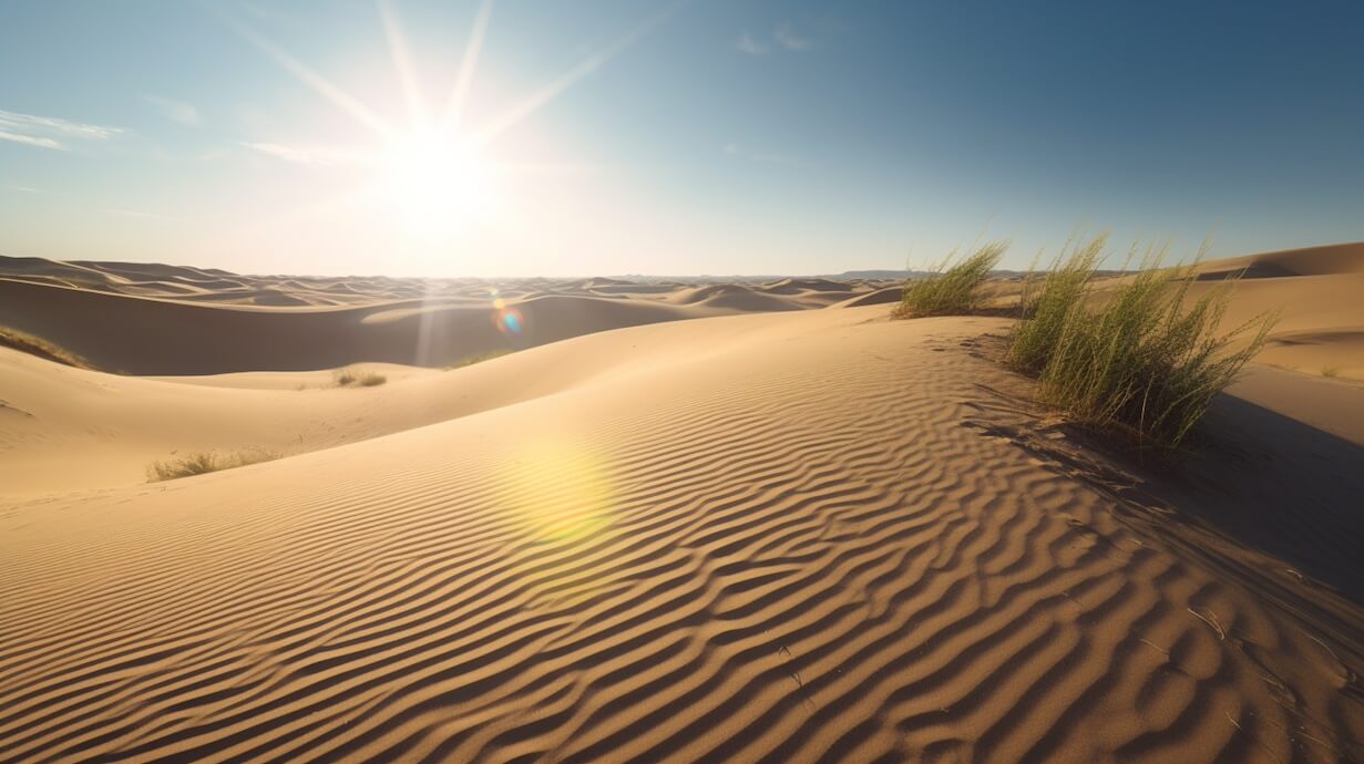 foto de un desierto, con dunas de arena y unos arbustos de juncos, bajo un cielo azul celeste